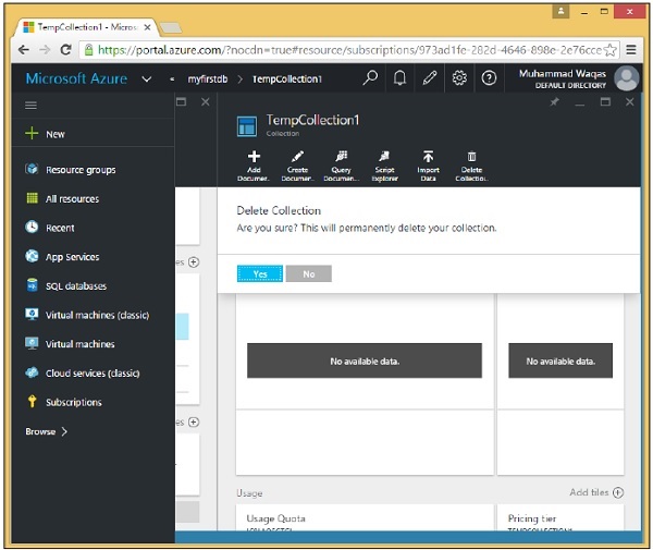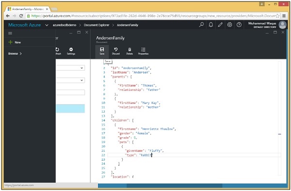Step 7 − Now click on the created DocumentDB account and you will see a detailed screen as the following image.