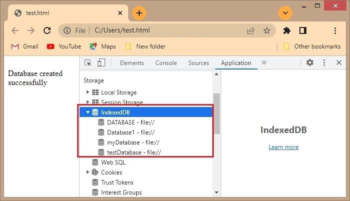 If IndexedDB is supported by your browser this program gets executed successfully, an a database will be created.